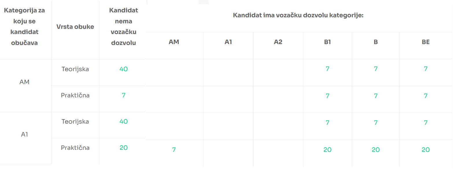 A1 – Motocikli čija radna zapremina motora nije veća od 125 cm3 i snage motora do 11 kW, i teški tricikli čija snaga motora ne prelazi 15 kW. Teorijska obuka kandidata može početi sa navršenih 15 godina života kao i polagati teorijski deo ispita, te završiti praktičnu obuku, dok za polaganje praktičnog dela ispita, kandidat mora imati navršenih 16 godina.